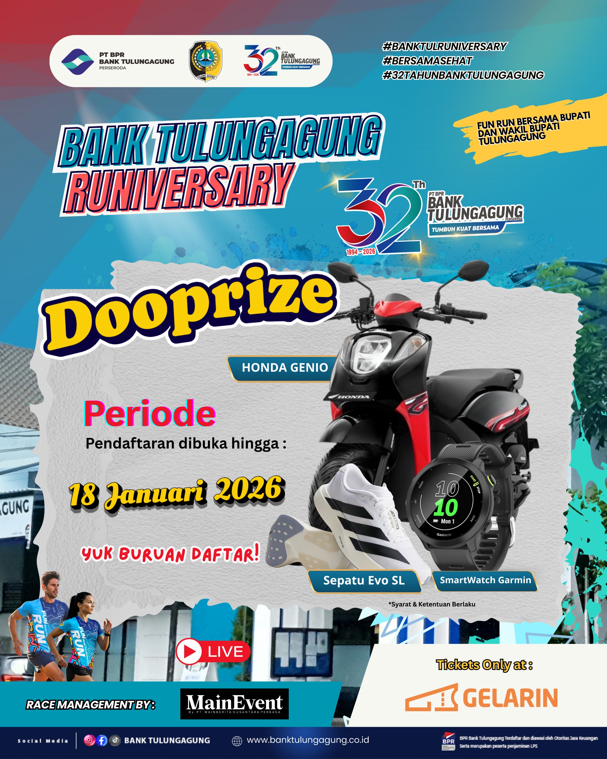 Mainberita – Tulungagung kembali dibuat bersemangat. Dalam rangka perayaan 32 Tahun Bank Tulungagung, ajang Bank Tulungagung Runiversary 2026 resmi merilis daftar doorprize yang langsung mencuri perhatian para pelari dan pecinta olahraga di wilayah Tulungagung dan sekitarnya.