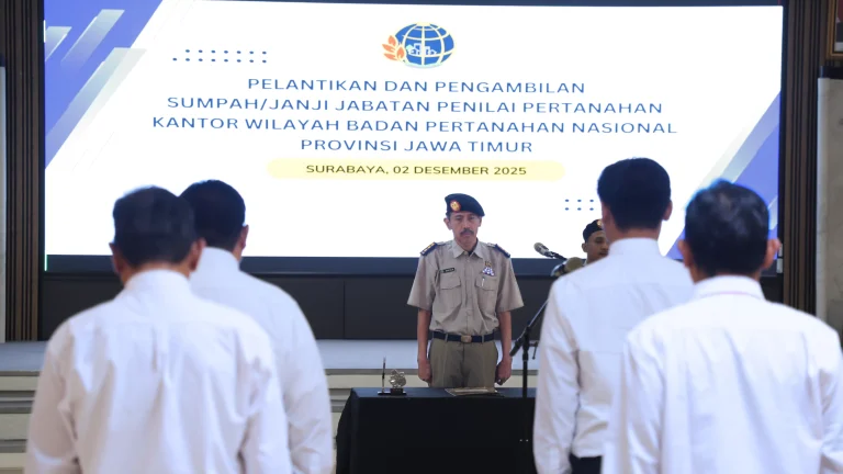 BLITAR – Pelantikan Penilai Pertanahan BPN Jatim digelar Kantor Wilayah Badan Pertanahan Nasional (BPN) Jawa Timur sebagai langkah strategis untuk meningkatkan kualitas layanan dan sinergi kemitraan. Acara berlangsung di Ruang Reforma Agraria Kanwil BPN Jatim pada Selasa (2/12).