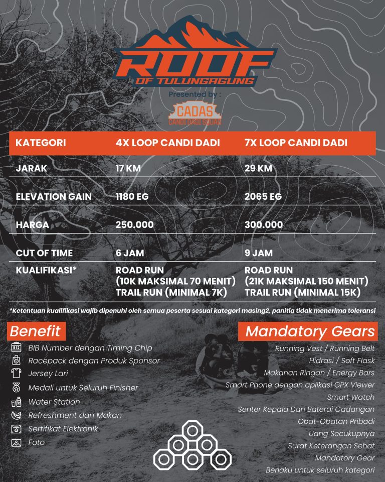 MAINBERITA TULUNGAGUNG – Tidak cukup hanya dengan semangat baja dan kaki yang kuat. Untuk menaklukkan lintasan cadas dan tanjakan epik di Roof of Tulungagung, para peserta wajib menyiapkan mandatory gear—perlengkapan penting yang akan menjadi teman setia di setiap langkah menuju puncak Candi Dadi.