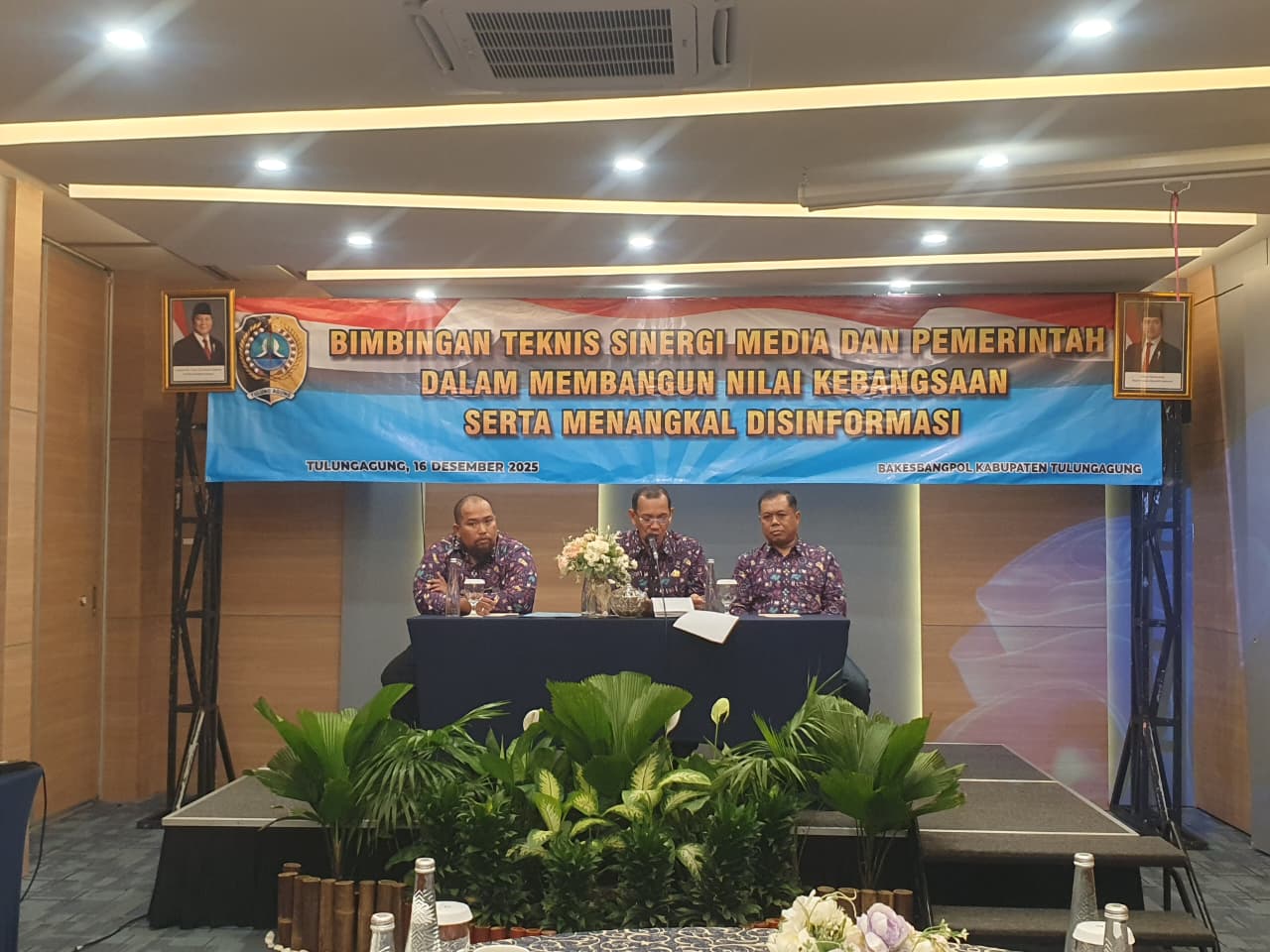 MainBeritaTulungagung – Derasnya arus informasi di era digital mendorong Badan Kesatuan Bangsa dan Politik (Bakesbangpol) Kabupaten Tulungagung memperkuat sinergi dengan insan pers. Upaya itu diwujudkan melalui bimbingan teknis (bimtek) sinergi media dan pemerintah dalam membangun nilai kebangsaan serta menangkal disinformasi, yang digelar di Hotel Azzana Tulungagung, Selasa (16/12).