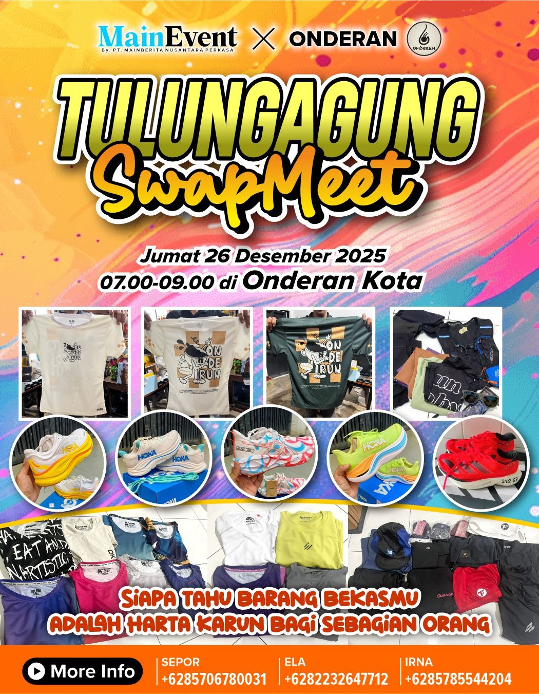 Diselenggarakan melalui kolaborasi MainEvent dan OndERAN, Tulungagung Swap Meet resmi menandai event jual beli barang bekas olahraga di Tulungagung. Lebih dari itu, konsep yang dihadirkan terbukti menjadi yang paling menyenangkan, santai, dan penuh interaksi antar komunitas.